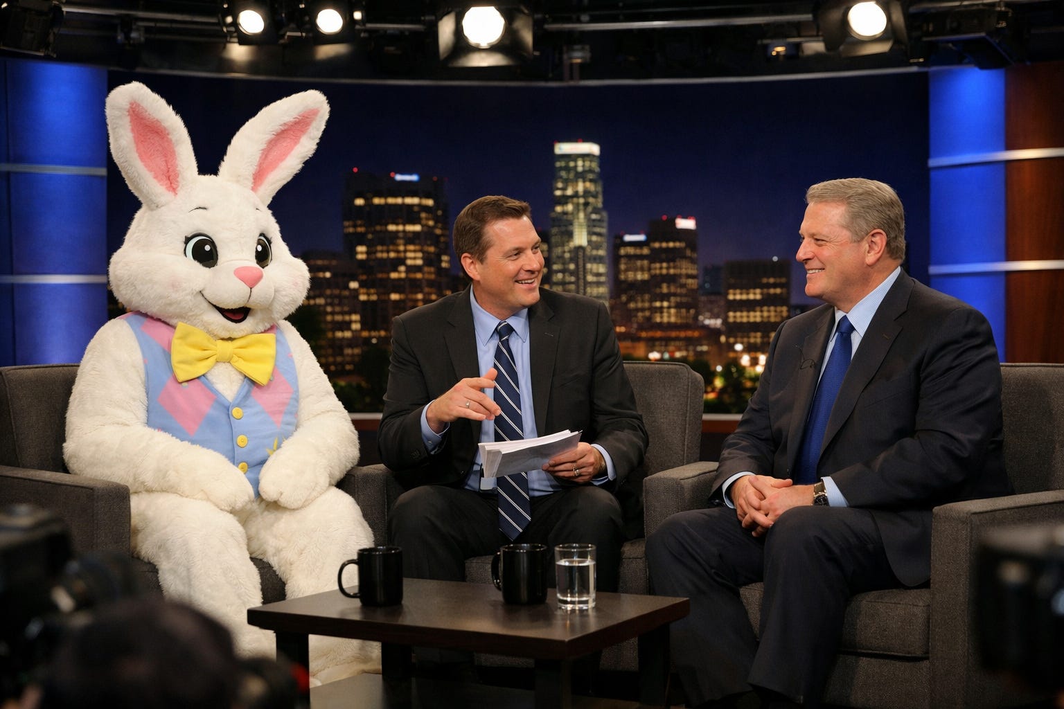 Given the fact that the weather climate change caused by the Easter Bunny’s wrath seemed to contradict Al Gore’s contention that we’d all be dead by now because of global warming, I was hoping to talk with them about it. As luck would have it, because both of them were available at the same time, I was able to sit down with them for an in-depth interview. My hope was to cover the weather climate change, the post-Easter snowpocalypse, and the kinds of projects both of them might have in the works. In the transcript that follows, I’m identified as FYV (Find Your Voice.) The Easter Bunny is identified as EB. And Al Gore is identified as OG (Original Grifter):