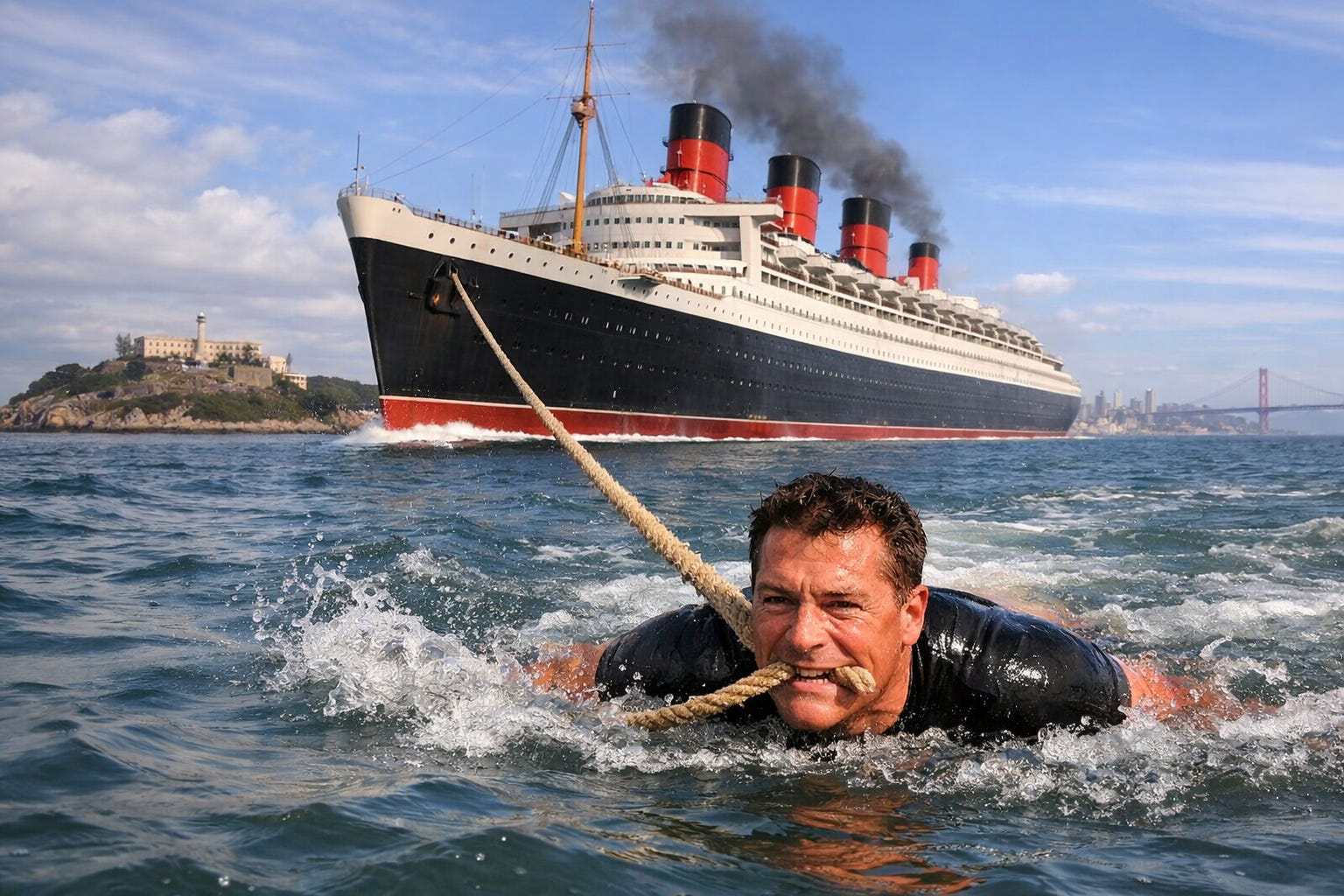 In 1955, at age 41, LaLanne swam from Alcatraz Island to the mainland (more specifically to Fisherman’s Wharf in San Francisco) wearing handcuffs. He was so tough, he’s reputed to have bitten a few sharks on his way across San Francisco Bay. In 1974, at age 60, he did it again. But that time, he was handcuffed, shackled, and towing the Titanic with his teeth. The good news is he made it. The bad news is because of the rope in his teeth, he couldn’t bite any sharks along the way.
