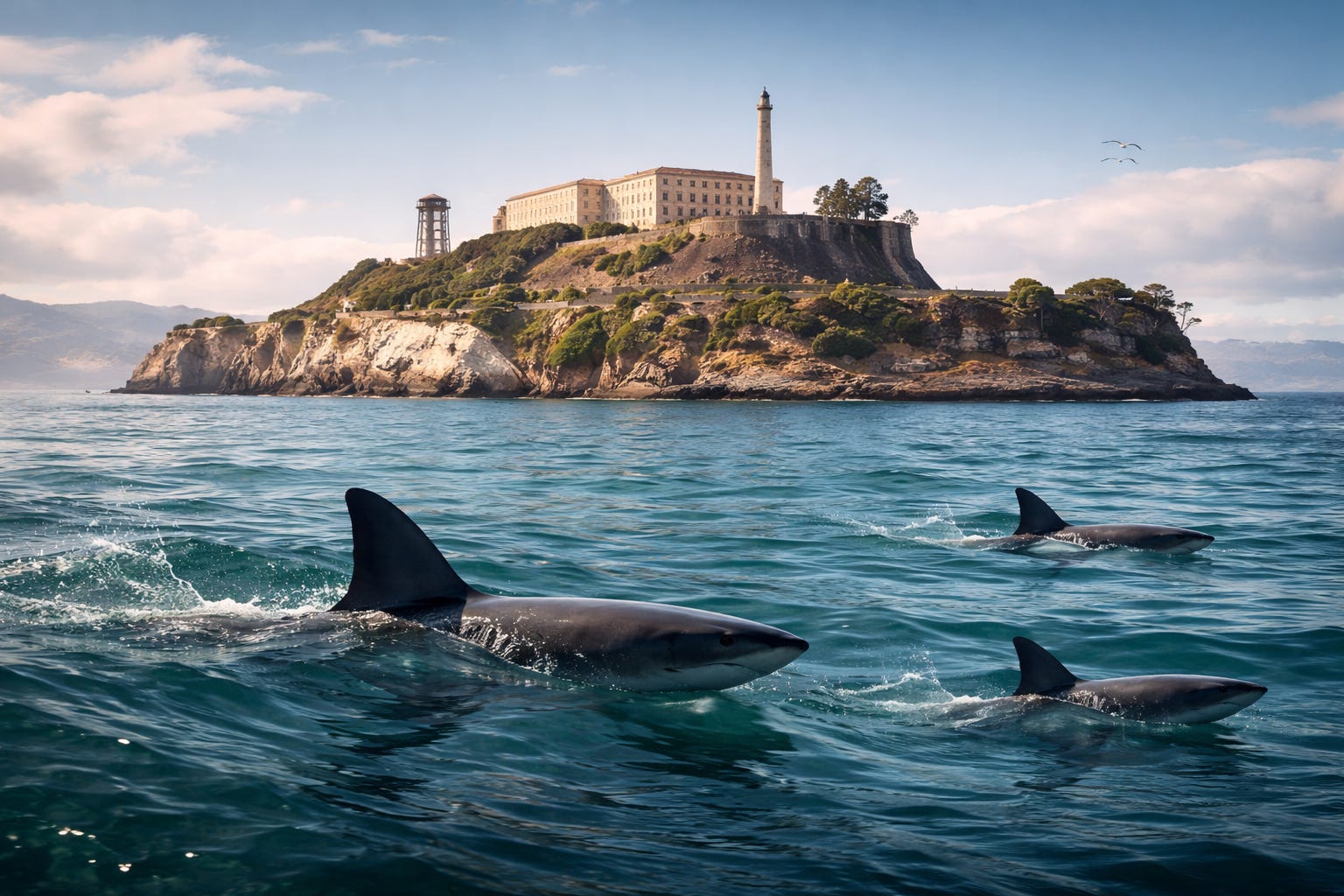 As many of you may know, Alcatraz Federal Penitentiary, often called The Rock, was considered escape-proof because of its isolated location in San Francisco Bay. Sitting about a mile-and-a-half from the mainland, the waters of the Bay were cold enough to cause hypothermia quickly. Their strong, turbulent currents and tides reached speeds of several knots. Strong swimmers would have found it extremely difficult to reach shore, even without the sharks that patrolled the waters.