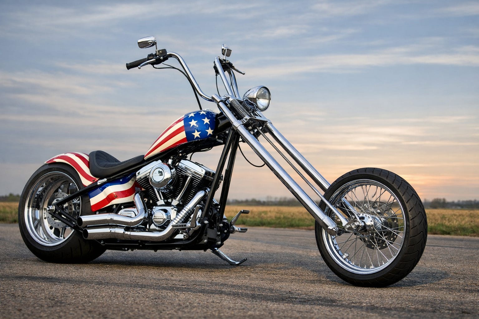 “I have a chopper, made to my specs, with a stretched frame, an increased rake angle, and extended forks. It has ape hangers, a hardtail frame, and an oversized rear wheel, with a custom gas tank and seat, and a stars-and-stripes paint job.