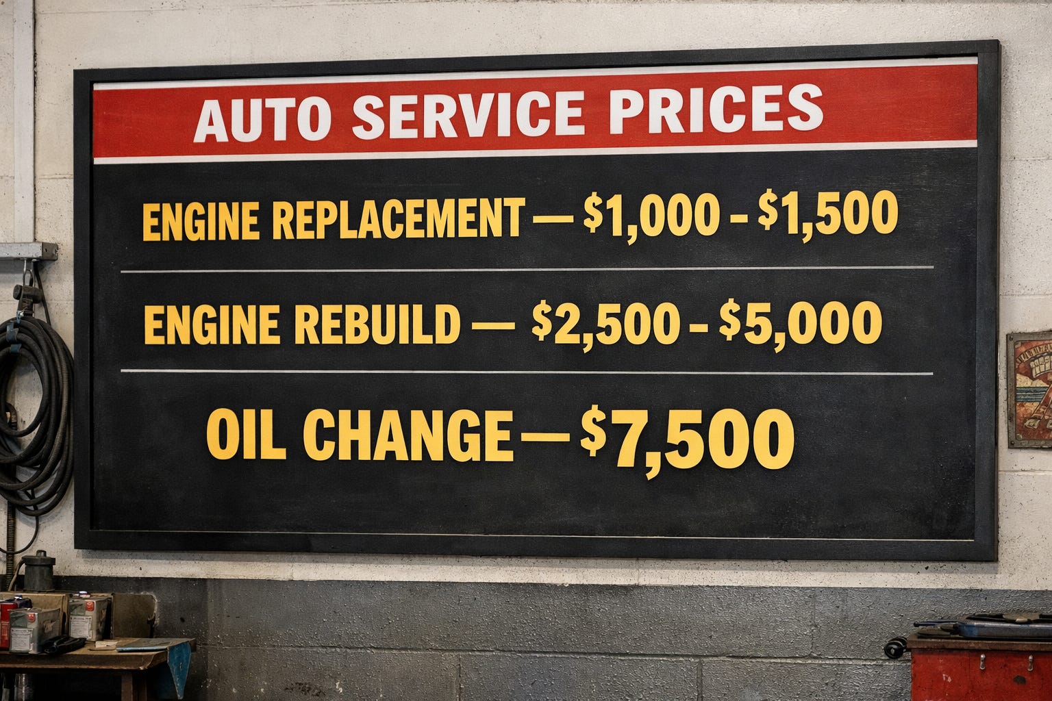 I drive a 2022 Chevrolet Trailblazer RS. I bought it used in January of 2025 during a severe attack of frugality. Since I drive fewer than 5,000 miles a year, it was only recently due for an oil change. When I stopped in to a local service station to make an appointment, I saw the sign above on the wall. When I recovered from the shock, I asked the mechanic on duty why an oil change was so expensive. He said something about a problem in the Middle East.