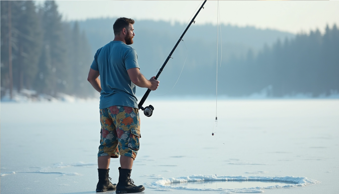 At the conclusion of the interview, Olov went back out on the ice to continue his fishing. He was wearing a t-shirt and shorts.
